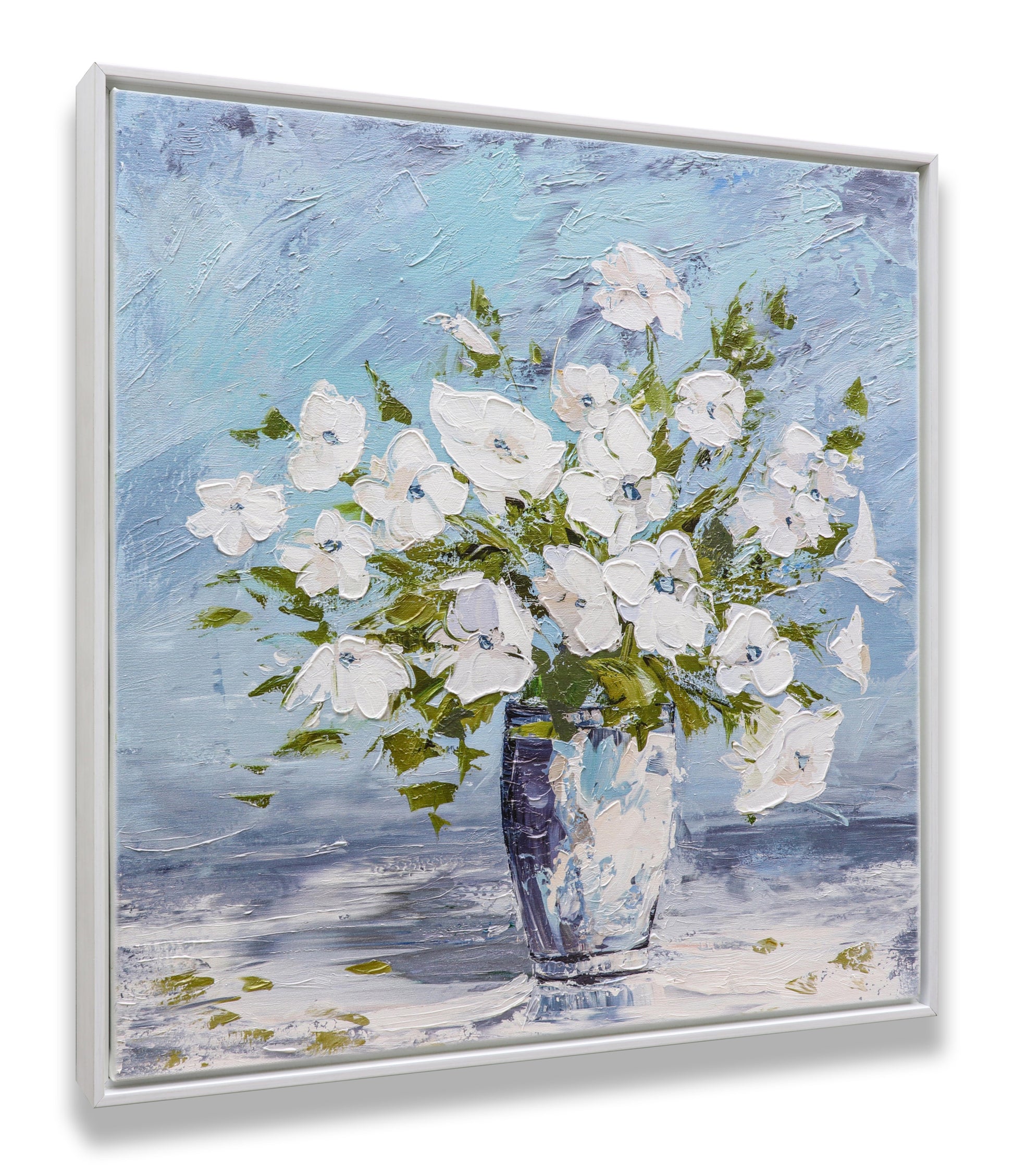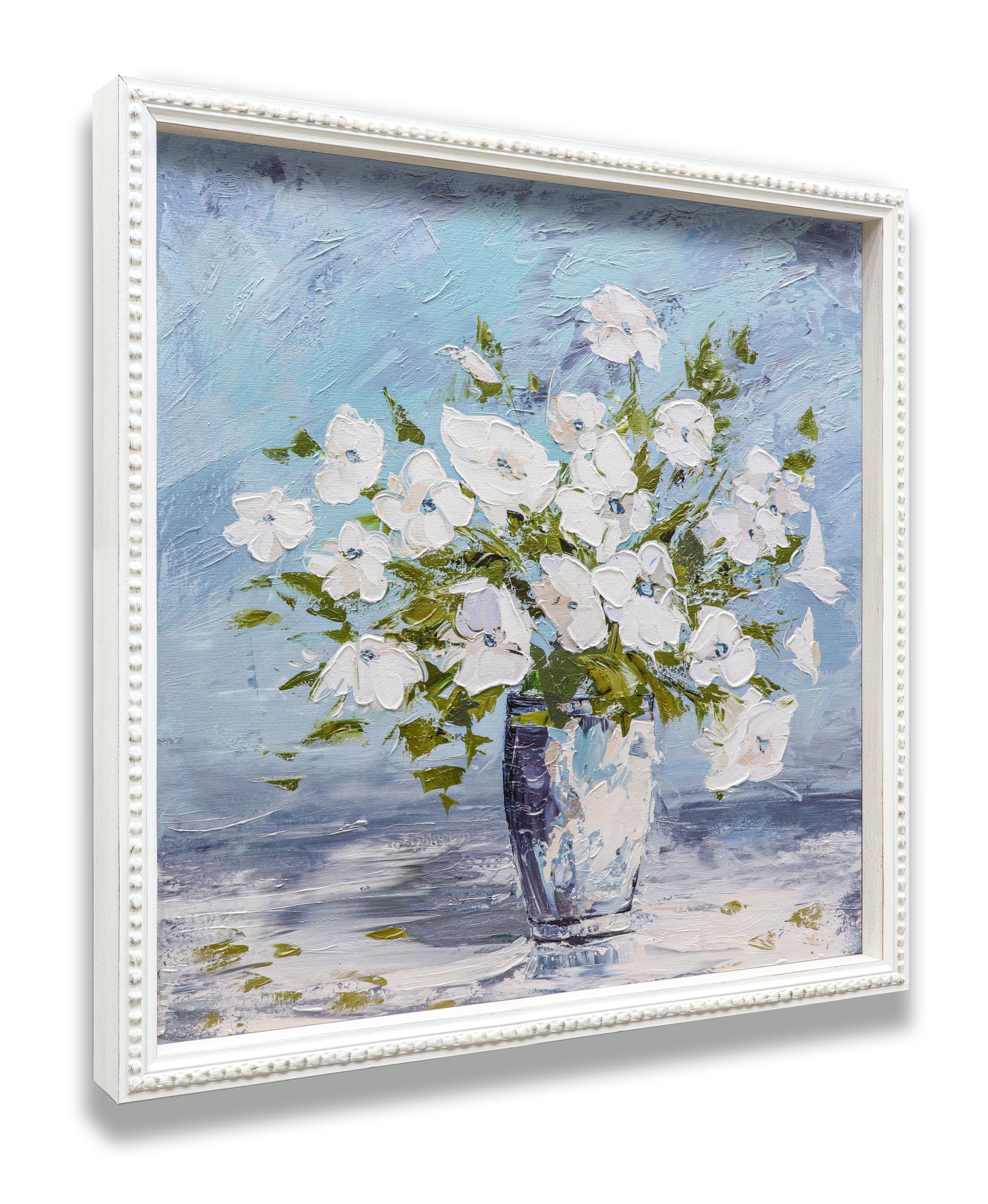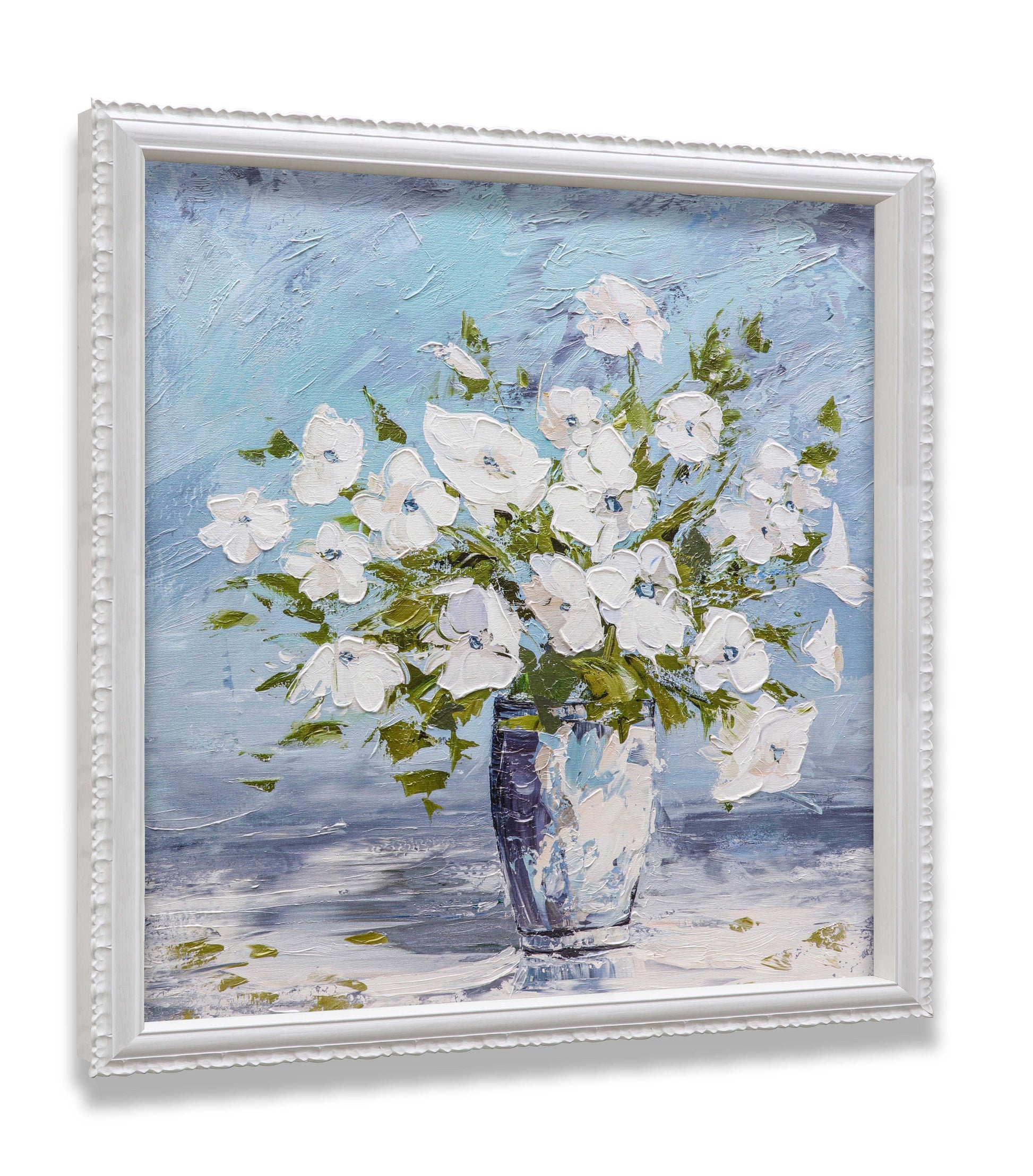 3D Print simulation hand painted texture on canvas painting Sweet Alyssum White Flowers Glass Vase Blue Wall 3D Brushstroke Texture UNIQUE INNOVATION Patent pending 3D Brushstroke Wood frame UNIQUE INNOVATION Patent pending