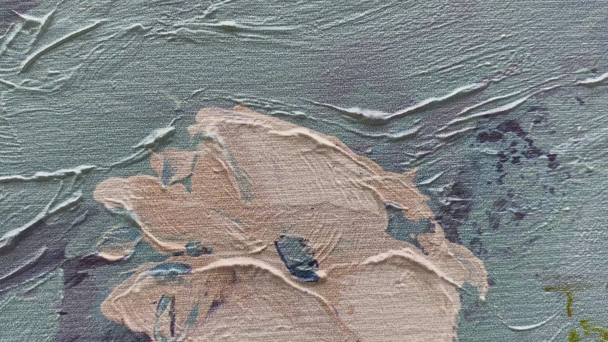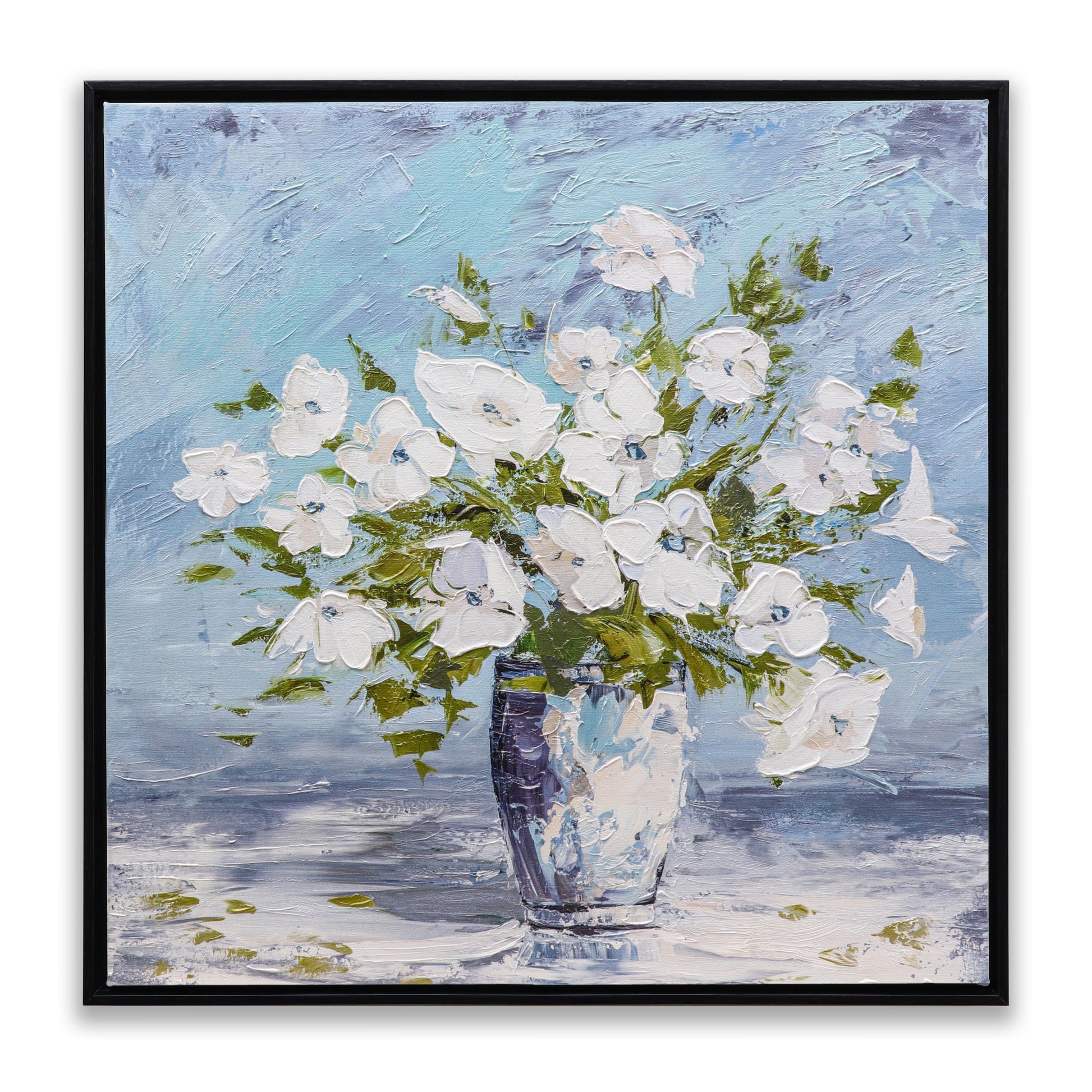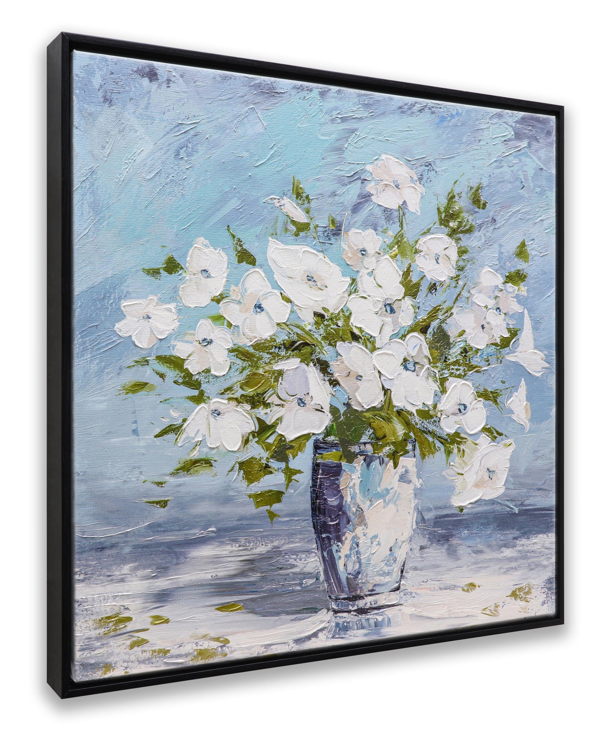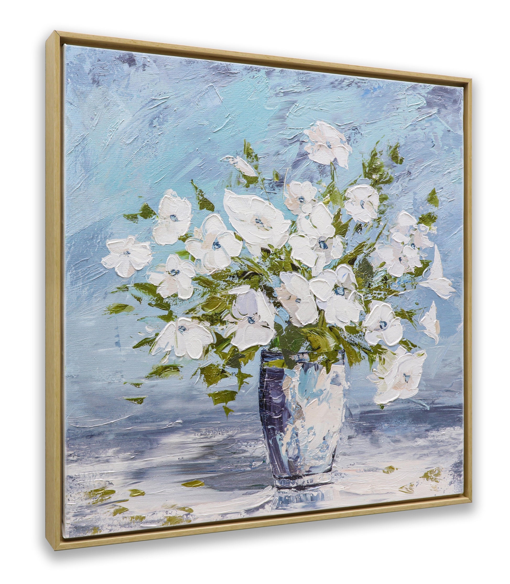 3D Print simulation hand painted texture on canvas painting Sweet Alyssum White Flowers Glass Vase Blue Wall 3D Brushstroke Texture UNIQUE INNOVATION Patent pending 3D Brushstroke Wood frame UNIQUE INNOVATION Patent pending