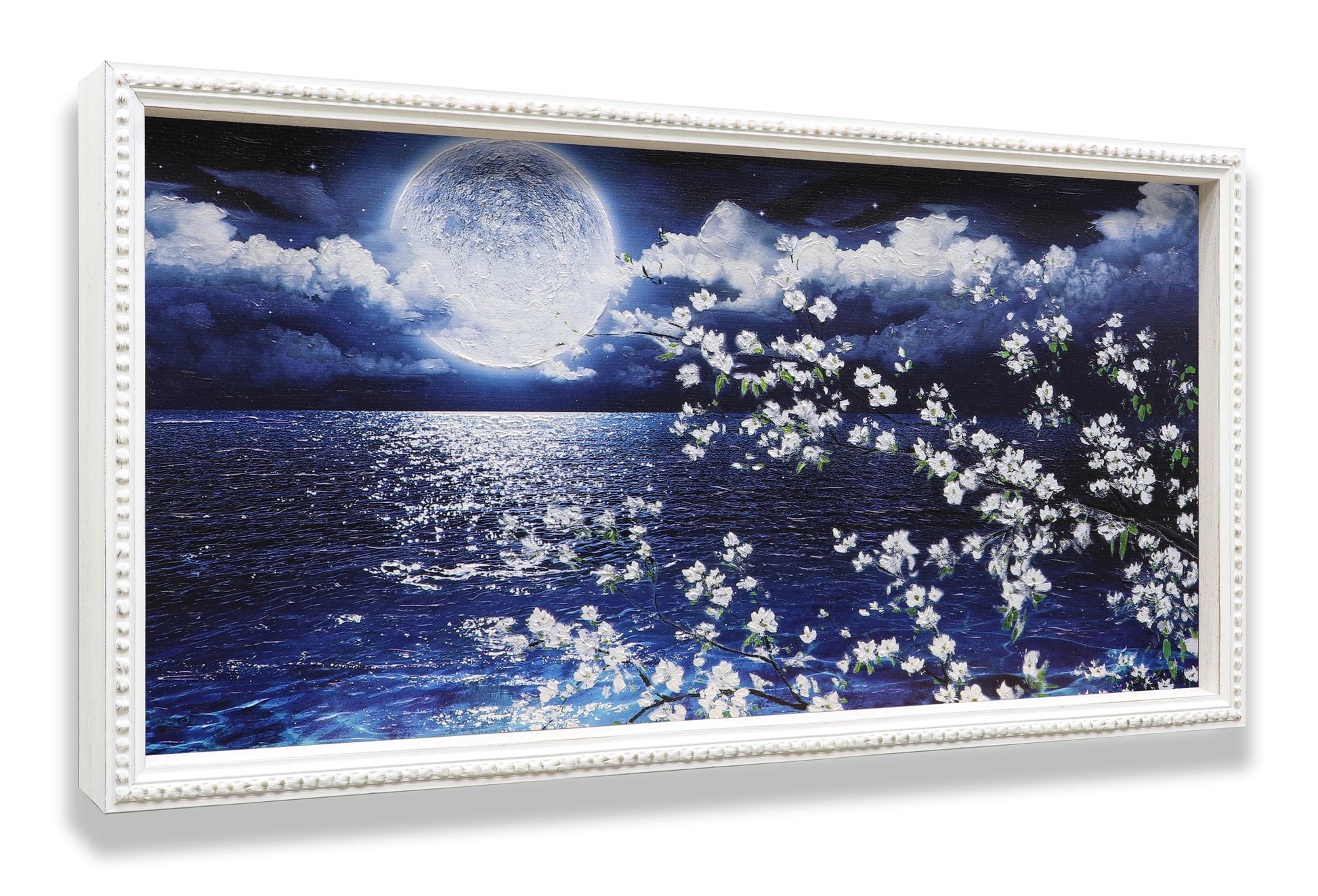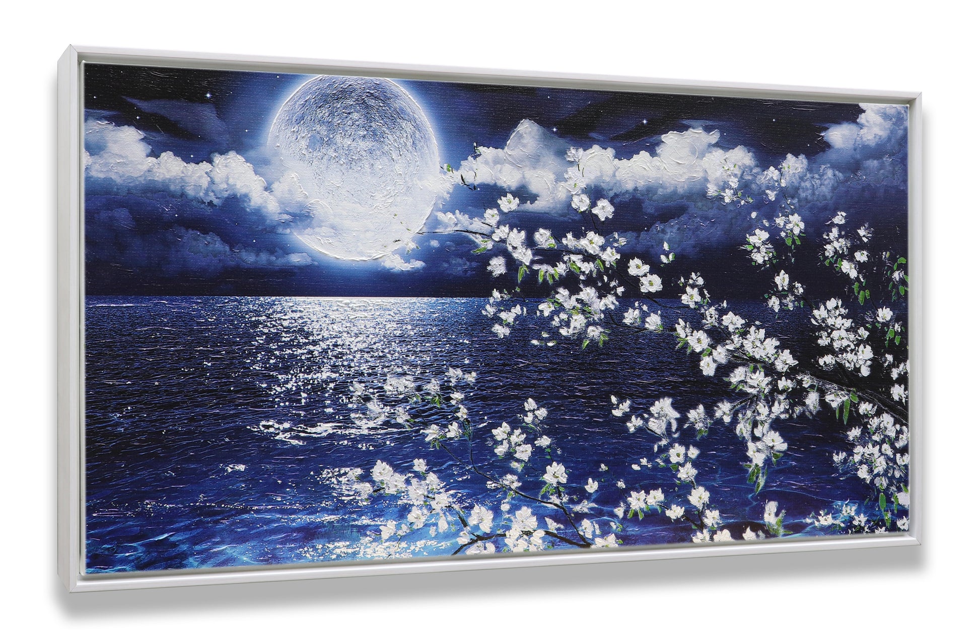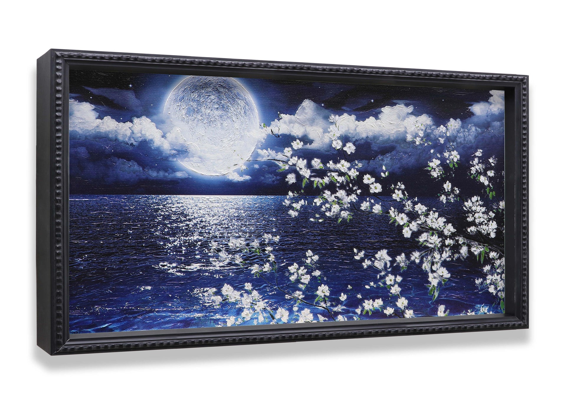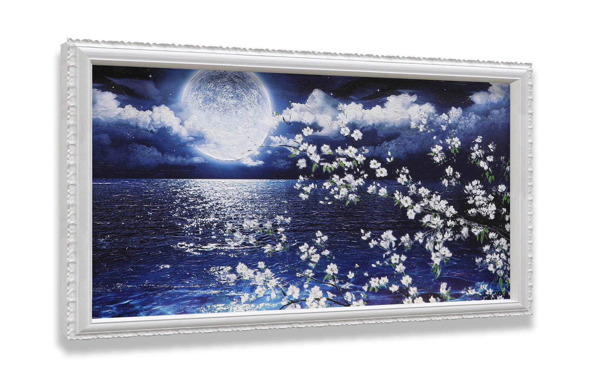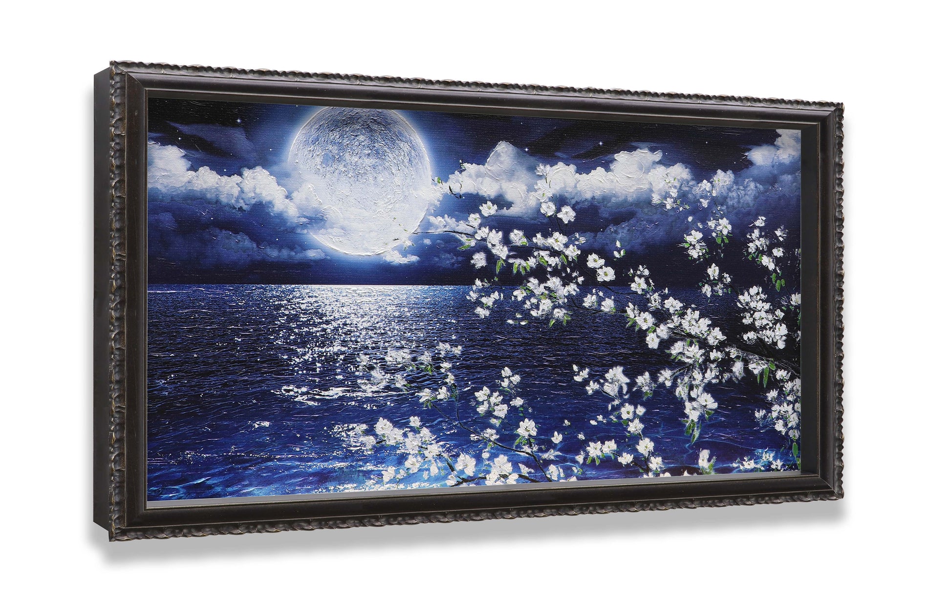 3D Print simulation hand painted texture on canvas painting Wall Art Night Moon Ocean Seascape White Cherry Blossom 3D Brushstroke Texture Wood frame UNIQUE INNOVATION Patent pending