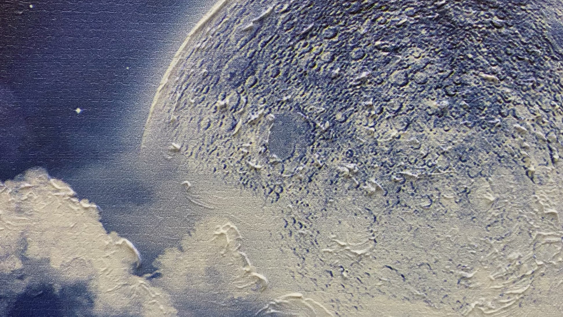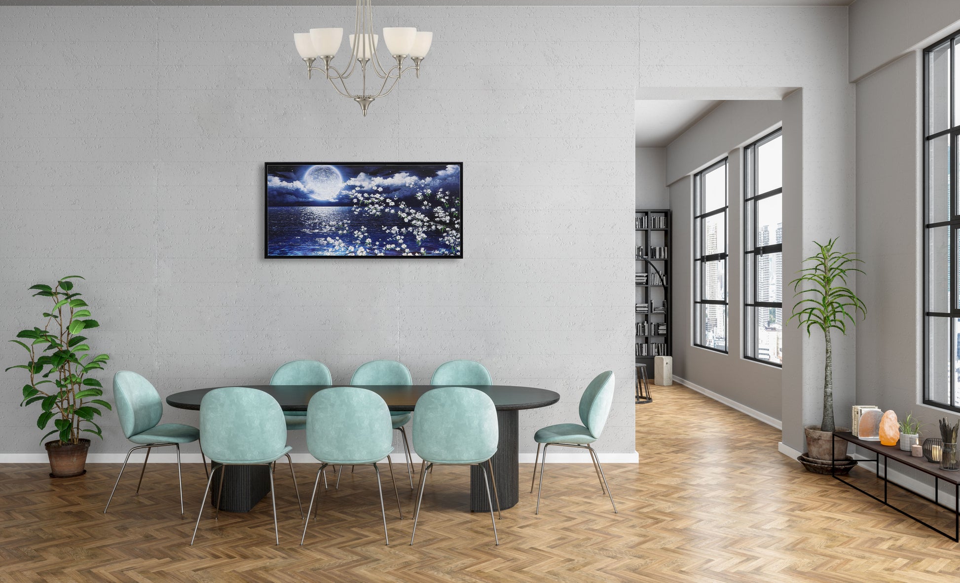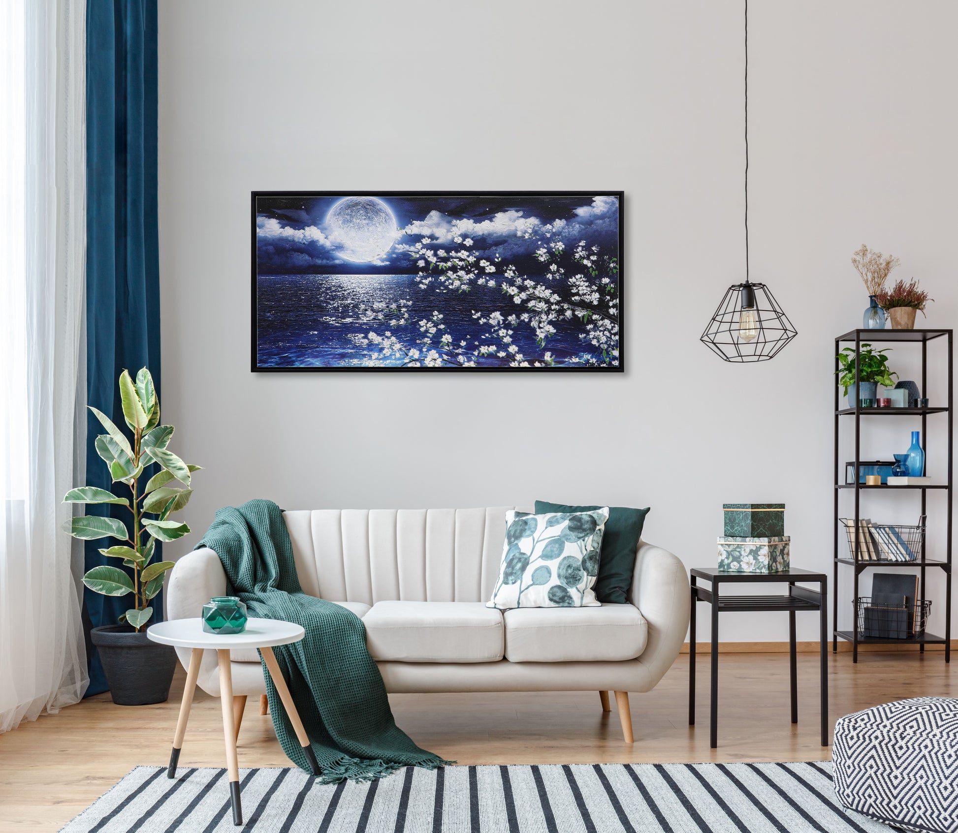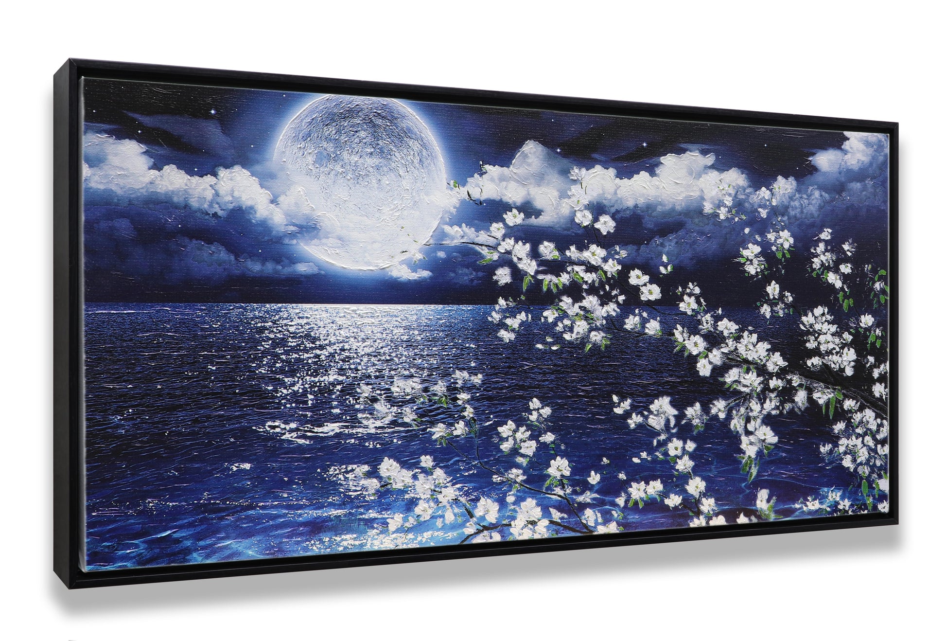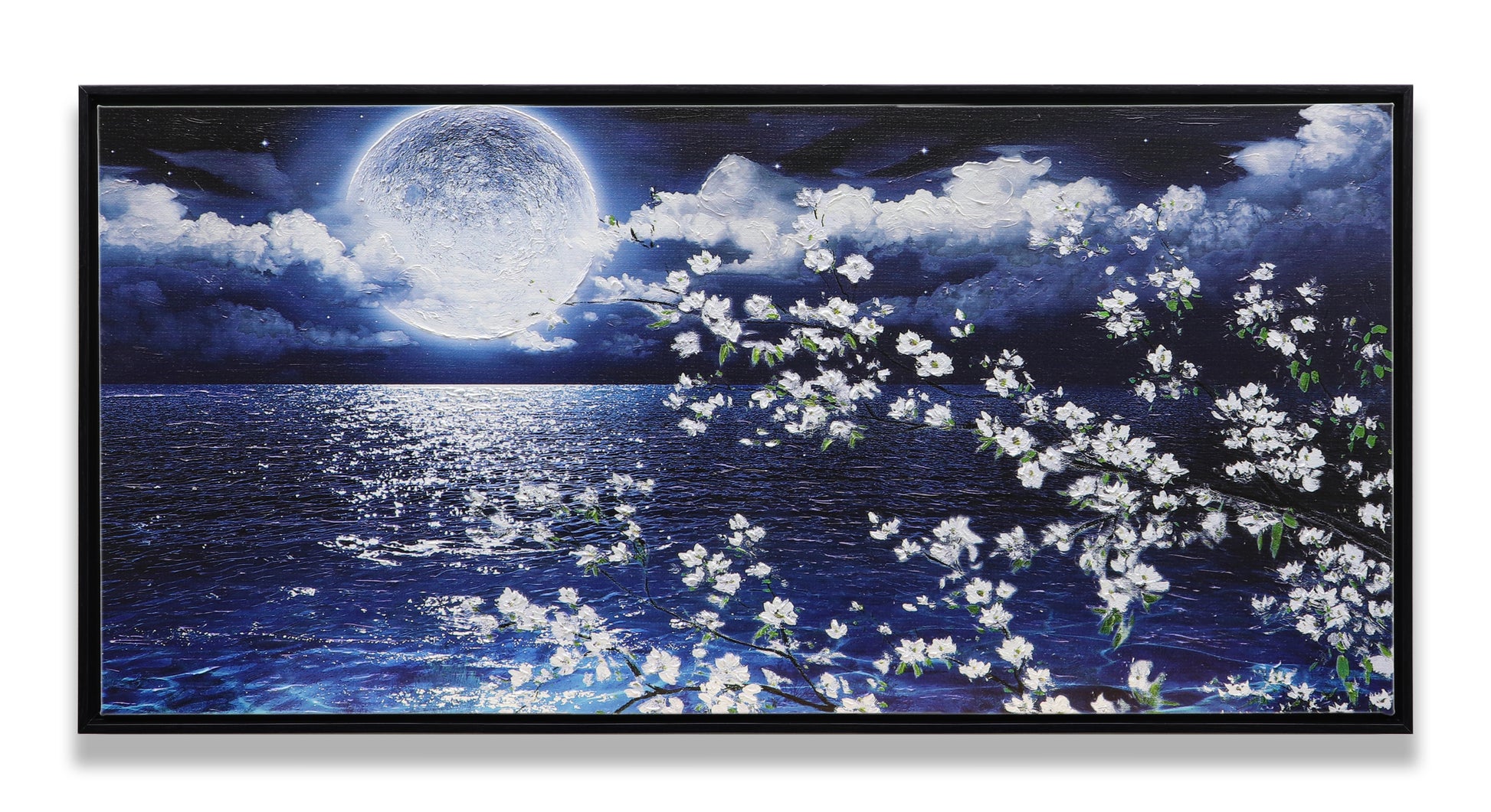 3D Print simulation hand painted texture on canvas painting Wall Art Night Moon Ocean Seascape White Cherry Blossom 3D Brushstroke Texture Wood frame UNIQUE INNOVATION Patent pending