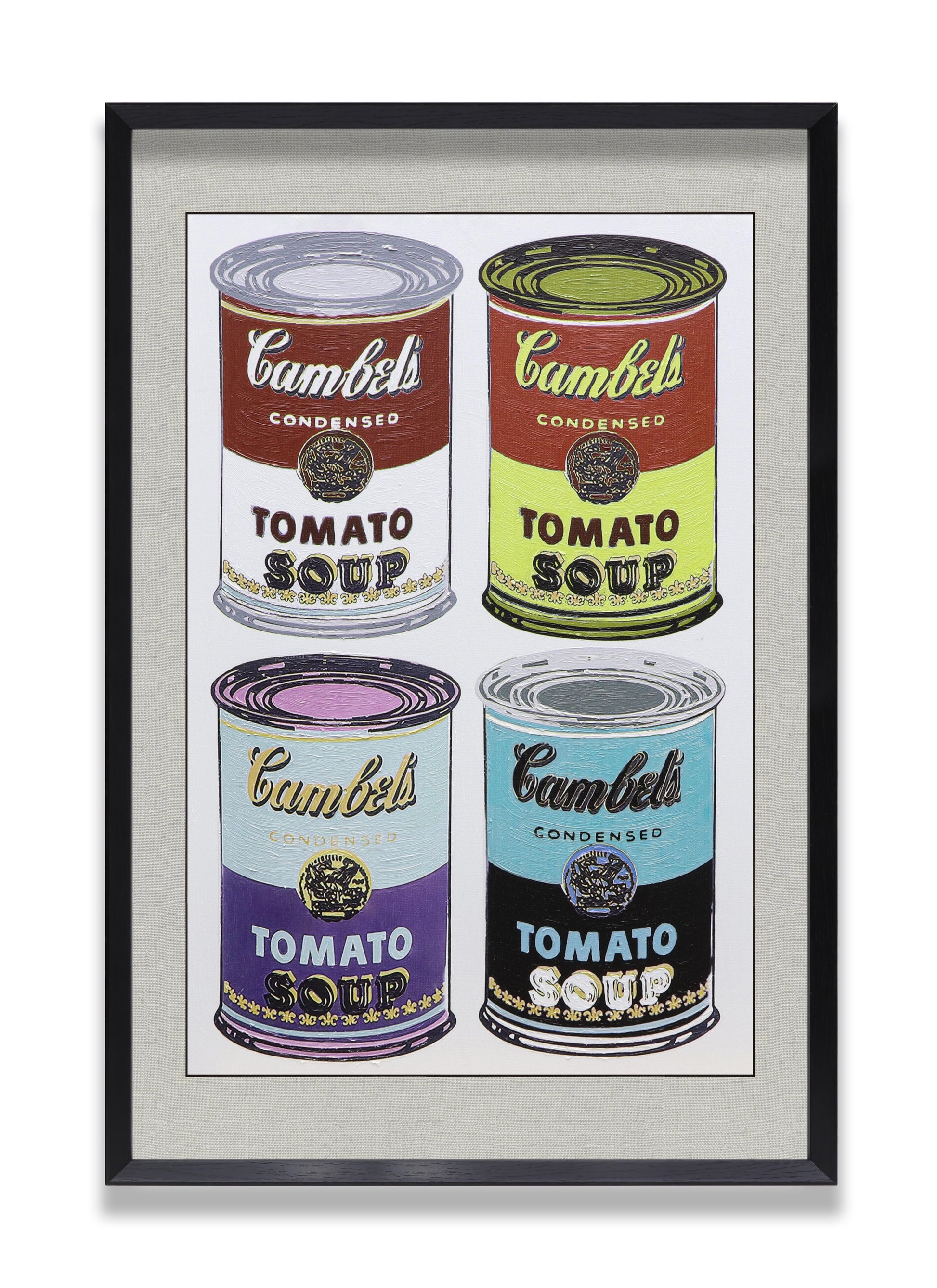 3D Print at micro-level precision simulation hand painted texture on canvas painting Wall Art Interpretation of Andy Warhol Pop Art on Campbell's Tomato Soup with Designer's thin (1mm) mattboard 3D Brushstroke Texture Wood frame UNIQUE INNOVATION Patent pending
